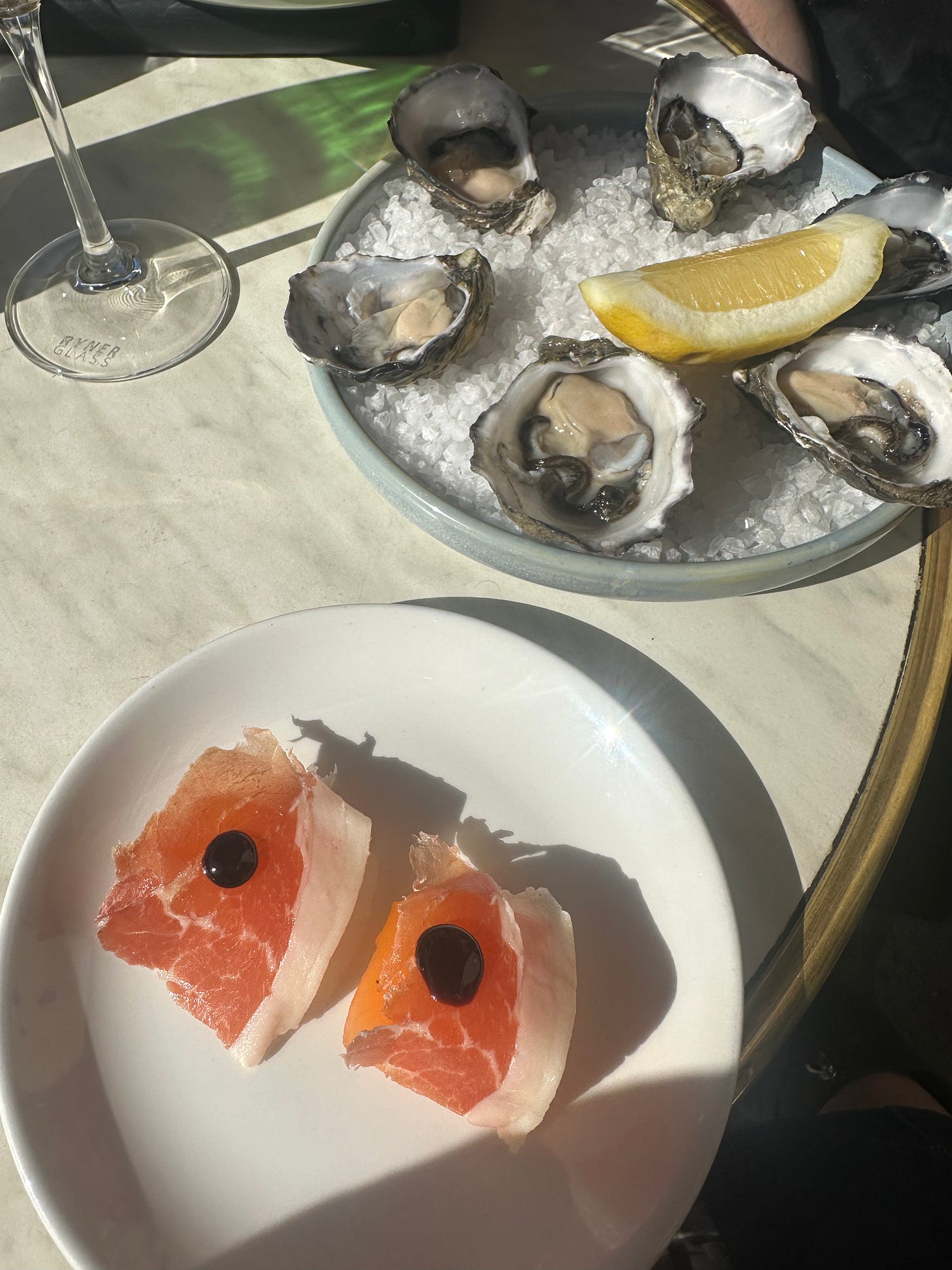 if you order food, they always bring you a little treat to start with! this day, we got a piece of melon wrapped in jamon with a drop of balsamic glaze - yum! the caviar on toast here is so good but also like $20 a pop…